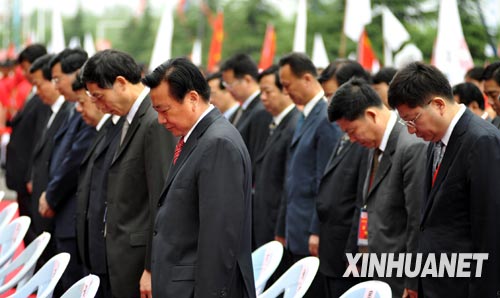 5月28日,在传递开始前,起跑仪式的全体参与者向在四川地震中的遇难同胞默哀。当日,北京奥运会圣火在安徽合肥传递。新华社记者 王雷 摄