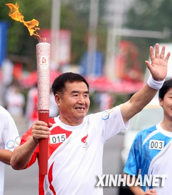 5月28日,奥运火炬手李年金手持火炬传递。新华社记者 邢广利 摄