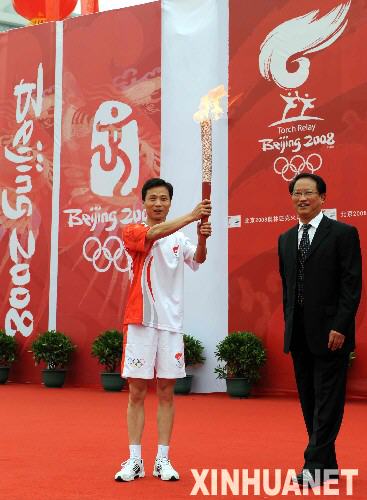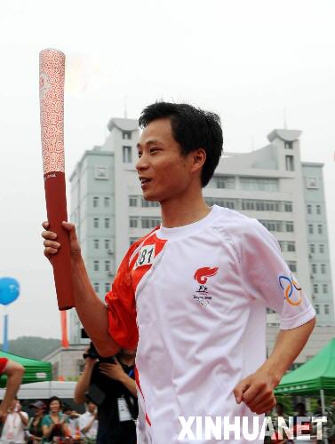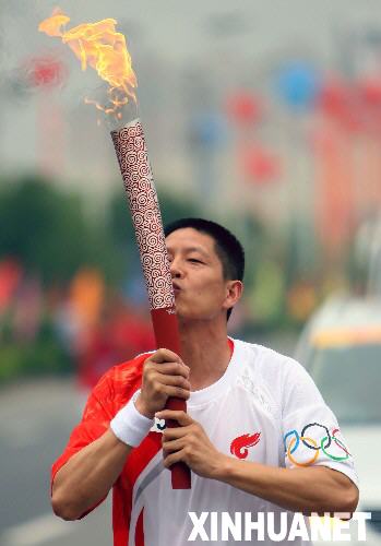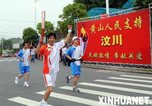 5月30日,奥运火炬手徐东明手持火炬传递。当日,北京奥运圣火在安徽黄山传递。新华社记者刘力航摄