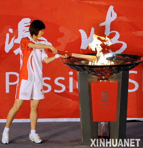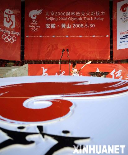 5月30日,奥运火炬手吴静点燃圣火盆。当日,北京奥运圣火在安徽黄山传递。新华社记者陈晔华摄