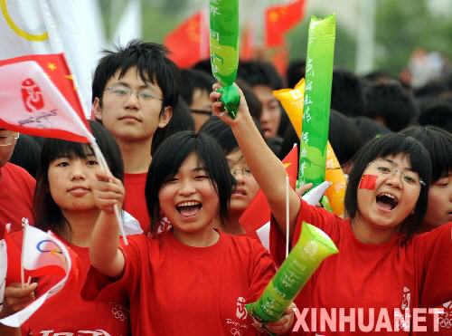 5月30日,观众为奥运圣火传递活动加油。当日,北京奥运圣火在安徽黄山传递。新华社记者王雷摄