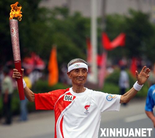 5月30日,奥运火炬手胡惠民手持火炬传递。当日,北京奥运圣火在安徽黄山传递。新华社记者邢广利摄